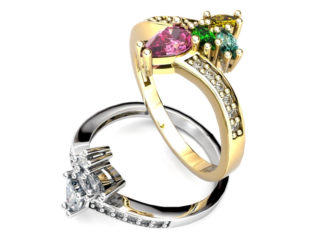 - Design: Kombinace centrálního kamene ve tvaru slzy, barevných akcentů a osazené šíny