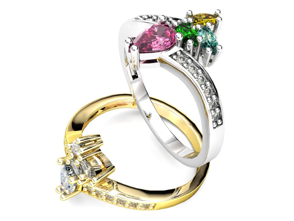 - Kameny: Centrální kámen ve tvaru slzy a další barevné zirkony (s možností nahrazení diamanty)