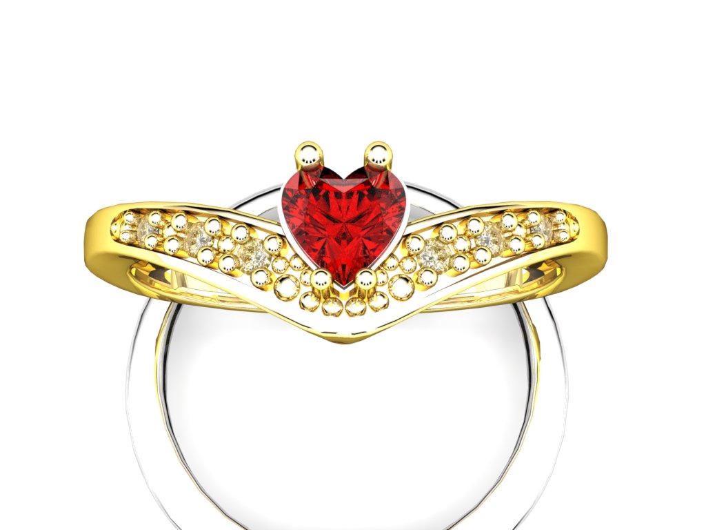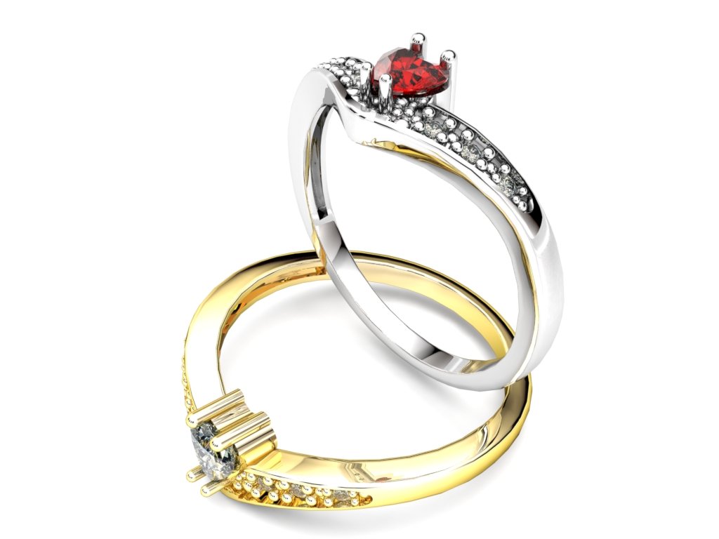 - Kameny: Centrální srdíčkový zirkon v červené barvě, drobné kameny podél šíny