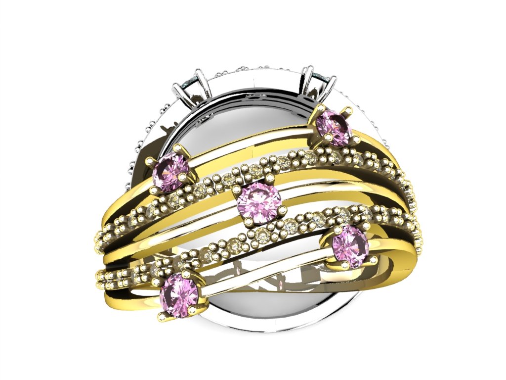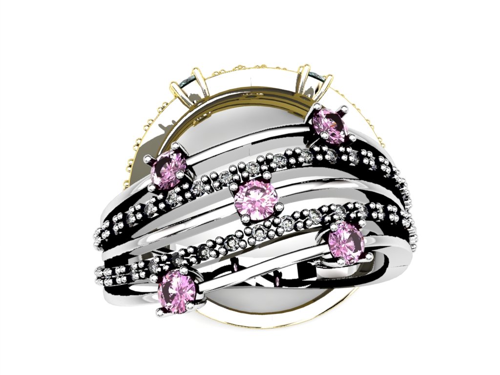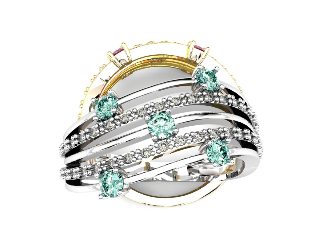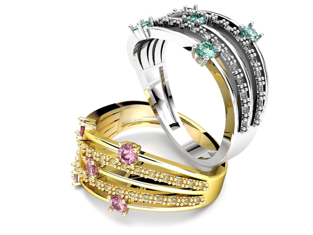 Tento jedinečný fashion prsten je mistrovským dílem, které spojuje eleganci a hravost. Prsten se skládá z několika elegantních vrstev šín, z nichž dvě jsou bohatě osázena drobnými kamínky. Vrcholem designu jsou barevné zirkony, které jsou rozmístěny a dodávají prstenu výrazný a moderní vzhled. Tento šperk je ideální pro ženy, které chtějí vyniknout a dodat svému stylu osobitý šmrnc.