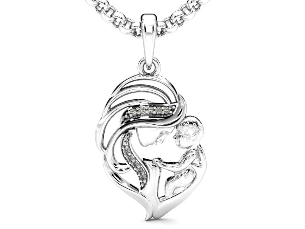 Elegantní přívěsek Matka s dítětem – dokonalý dar na památku narození dítěte, s možností volby barvy kamenů: modré nebo červené.